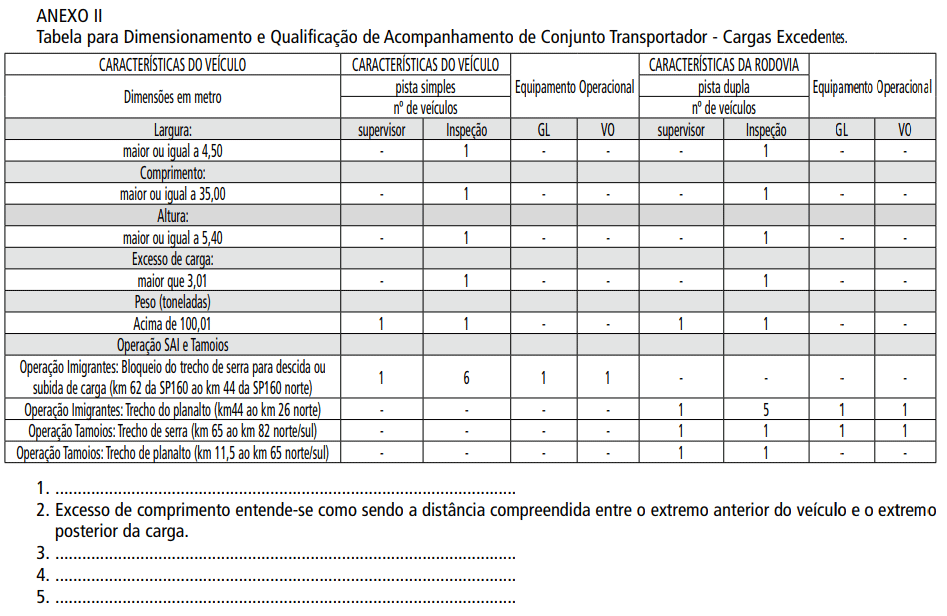 PARADA Imobilização do veículo com a finalidade e pelo tempo estritamente necessário para cumprimento de horários de restrição, descanso ou por razões de segurança emergências. PASSAGEM DE NÍVEL Todo cruzamento de nível entre uma via e uma linha férrea ou trilho de bonde com pista própria. PASSAGEM SUBTERRÂNEA Obra de arte destinada à transposição de vias, em desnível subterrâneo, e ao uso de pedestres ou veículos. PASSARELA Estrutura rodoviária destinada à transposição de vias, em desnível aéreo, e ao uso de pedestres. PATRULHAMENTO Função exercida pela Polícia Rodoviária Federal com o objetivo de garantir obediência às normas de trânsito, assegurando a livre circulação e evitando acidentes. PERÍMETRO URBANO Limite entre área urbana e área rural. PERMISO ORIGINÁRIO Documento de Idoneidade, de porte obrigatório para realizar transporte internacional, provando que sua integração social cumpre com o previsto nos Acordos de Transporte Internacional. PESCOÇO (goose-neck) Tipo de construção de semirreboque prancha com estrutura rebaixada, dotado de região para acoplamento no veículo-trator, em posição mais elevada que a plataforma de carga. PESCOÇO HIDRÁULICO Mecanismo dotado de cilindros hidráulicos, que serve de acoplamento entre o semirreboque e o trator rodoviário, utilizando o engate universal quinta roda e pino rei.Utilizado para permitir o carregamento da carga pela dianteira do semirreboque. Semirreboque prancha dotado de mecanismo hidráulico capaz de acoplar e desacoplar a região posterior, permitindo o carregamento do veículo pela dianteira. PESO BRUTO DO VEÍCULO No caso de um veículo a motor, a soma dos pesos transmitidos à superfície da via por todas as rodas do veículo. No caso de semirreboque a soma dos pesos transferidos ao pavimento (portanto, a soma dos pesos nos seus eixos). PESO BRUTO TOTAL Peso máximo que o veículo transmite ao pavimento, constituído da soma da tara mais a lotação. PESO BRUTO TOTAL COMBINADO Peso máximo transmitido ao pavimento pela combinação de um caminhão-trator mais seu semirreboque ou do caminhão mais o seu reboque ou reboques. PESO MÁXIMO AUTORIZADO O peso máximo para a utilização, em tráfego, de um veículo carregado. PINO-REI (king-pin) Dispositivo padrão de engate instalado no semirreboque que permite o seu acoplamento ao veículo-trator. PISTA Parte da via normalmente utilizada para a circulação de veículos, identificada por elementos separadores ou por diferença de nível em relação às calçadas, ilhas ou aos canteiros centrais. PLACAS DE SINALIZAÇÃO Elementos colocados na posição vertical, fixados ao lado ou suspensos sobre a pista, transmitindo mensagens de caráter permanente e, eventualmente, variáveis, mediante símbolo ou legendas pré-reconhecidas e legalmente instituídas como sinais de trânsito. PLANO DE AMARRAÇÃO Ou Plano de Carga (ou ainda “load plan”): documento com a especificação técnica dos dispositivos de amarração necessários para determinada carga, contendo: quantidade, especificações, local de ancoragem e posicionamento dos sistemas de fixação da carga. PLATAFORMA DE CARGA Estrutura do veículo adequada ao apoio da carga. POLICIAMENTO OSTENSIVO DE TRÂNSITO Função exercida pelas Polícias Militares com o objetivo de prevenir e reprimir atos relacionados com a segurança pública e de garantir obediência às normas relativas à segurança de trânsito, assegurando a livre circulação e evitando acidentes. PONTE Obra de construção civil destinada a ligar margens opostas de uma superfície. PRANCHA Semirreboque com carroceria do tipo plataforma sem grades, adequada ao transporte de cargas indivisíveis. Podem ser: Semirreboque prancha Reboque prancha |